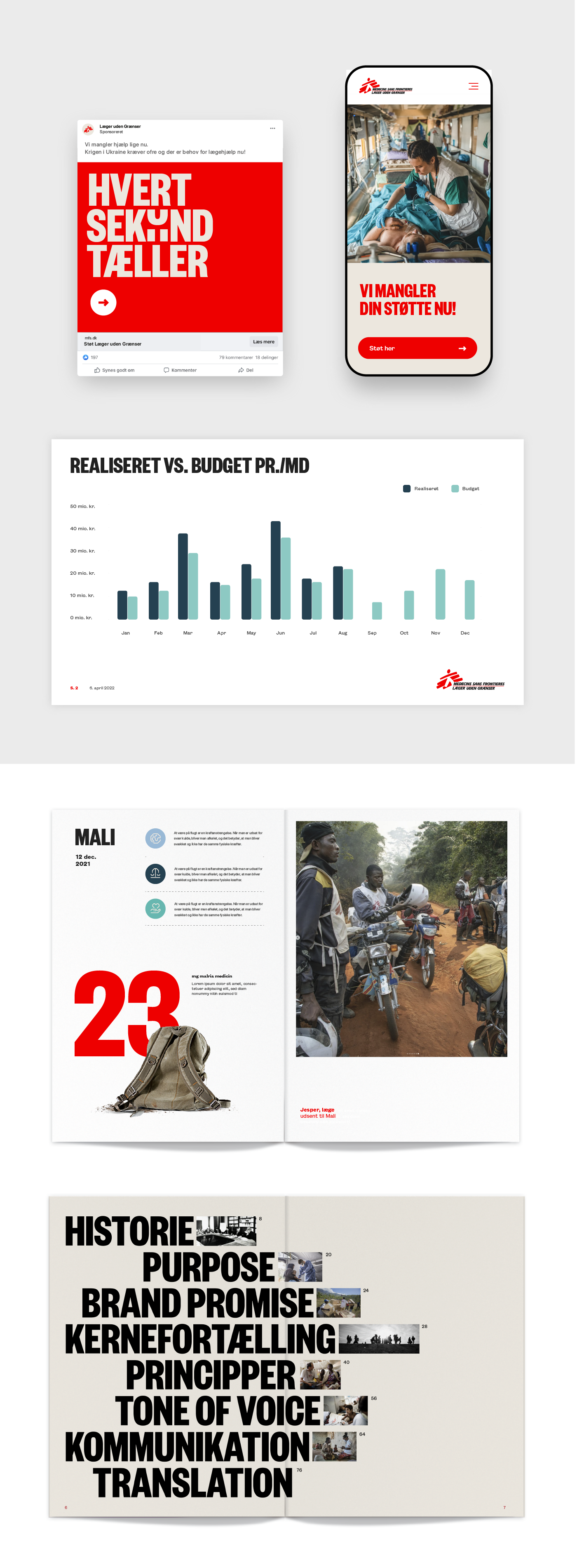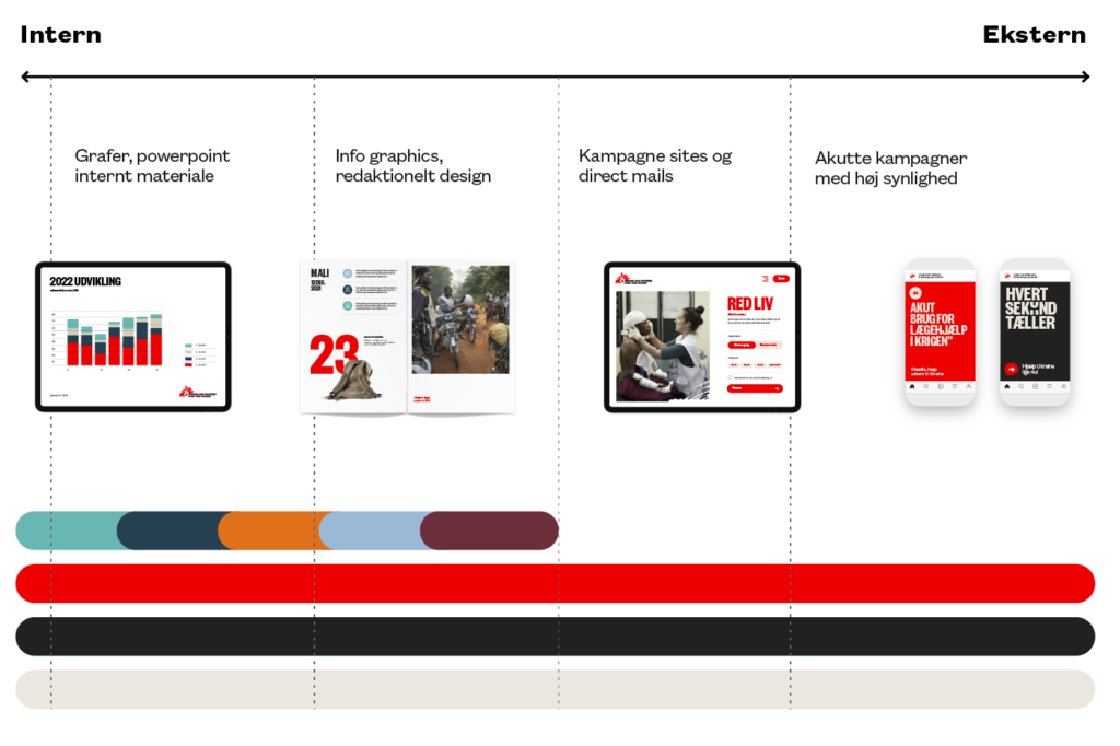 Når der ønskes høj grad af synlighed og formidling af noget akut anvendes få, markante farver (rød og sort), ofte i kombination med korte budskaber, farveflader og Founders Grotesk x-condensed. Det kan fx være i en indsamlingskampagne, når en akut katastrofe er opstået.