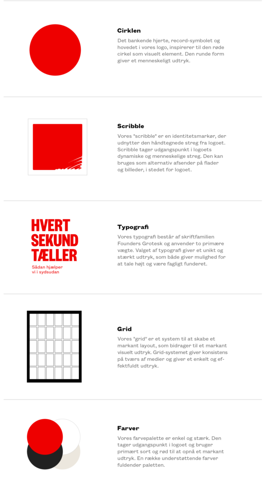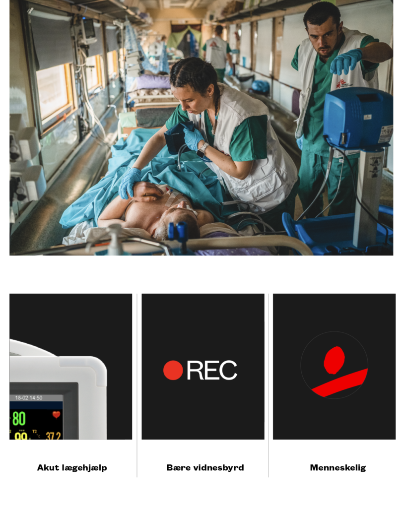 Læger uden Grænsers purpose, historie, logo og farve har inspireret til et visuelt koncept, som er enkelt, klart og tydeligt. Tre vigtige søjler i vores identitet danner grundlag for brandets visuelle udtryk.